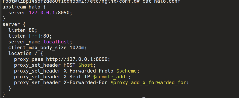 halo2默认启动是8090端口,所以访问的时候需要通过ip:8090的方式才能够访问到主页,但是域名解析只能支持到ip地址,没法到8090端口的,所以需要通过nginx代理将80端口的请求转发到8090端口