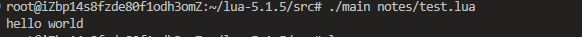 print("hello world")利用刚才的c文件导入这个lua文件,就能够得到lua的执行结果
